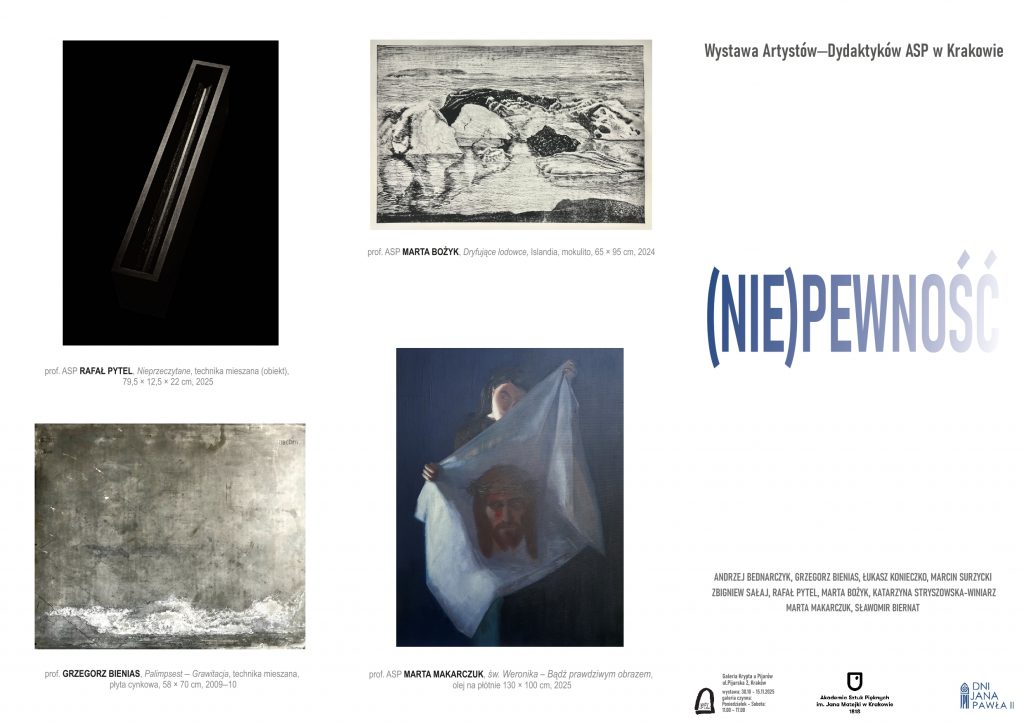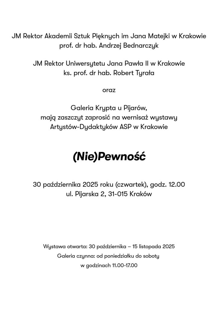 Zapraszamy na wernisaż wystawy Artystów-Dydaktyków ASP w Krakowie pt. „(Nie)Pewność„, który odbędzie się 30 października 2025 r. (czwartek) o godz. 12.00 w Galerii Krypcie u Pijarów.